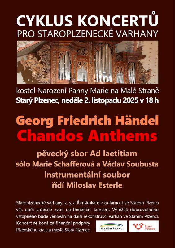 (Kostel Narození Panny Marie ve Starém Plzenci na Malé Straně)V rámci benefičního koncertu pro staroplzenecké varhany vystoupí pěvecký sbor Ad laetitiam se sólolisty Marií Schafferovou a Václavem, Soubustou. Instrumentální soubor řídí Miloslav Esterle.